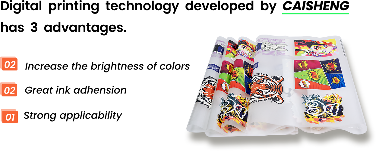 The CAISHENG printing film has strong ink absorption performance, restore fresh & bright colors, no powder resides, no water marks, low shrinkage rate, adapt to cold and hat peel after application (depends on customer power capability), can be widely used in different manufacturing requirements, Both 75um and 100um thickness available for the film substrate, and client and customize single or double faced release coating for the printing film.